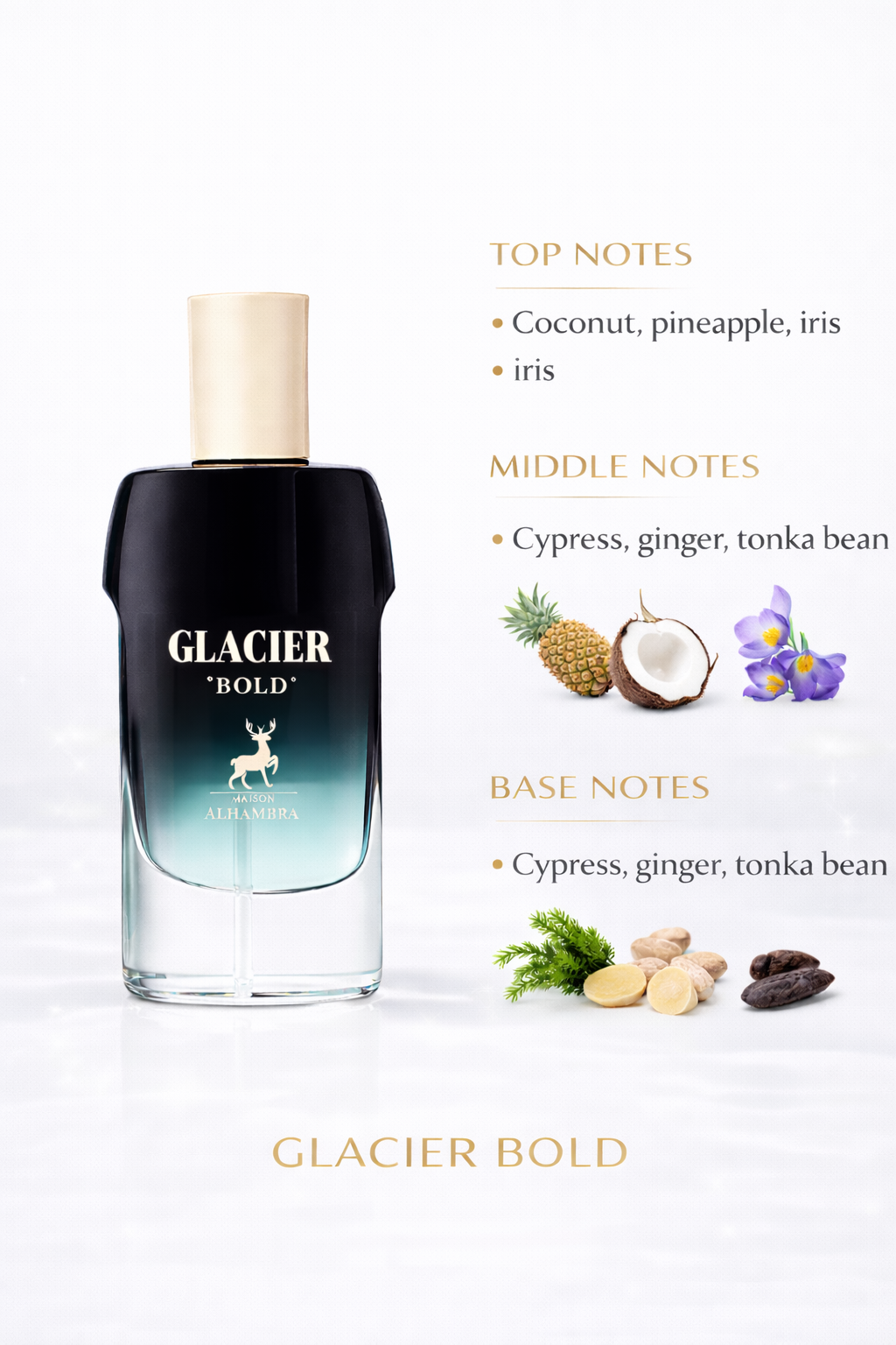 Glacier Bold EDP envelops you in a fresh, invigorating aura, blending crisp citrus with creamy woods and a hint of sweetness. This fragrance evokes the sensation of a cool breeze over sun-warmed skin, leaving a trail of confidence and allure. Perfect for those who crave a bold yet refined signature scent.
